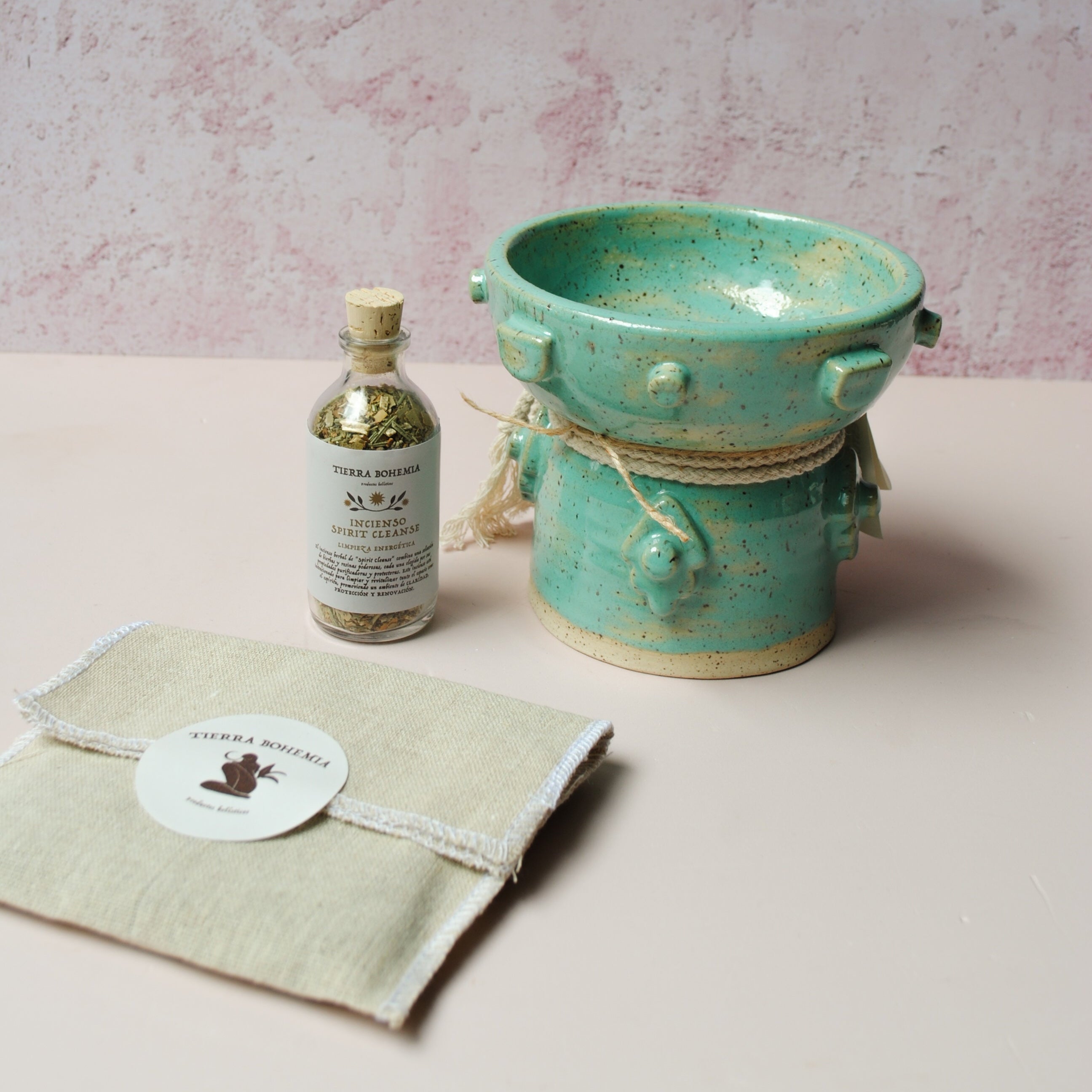 Este set fue creado en colaboración con Estudio Kiin, quienes moldearon a mano cada copalera en cerámica de alta temperatura, inspirándose en la tierra, el fuego y la conexión con lo ancestral.