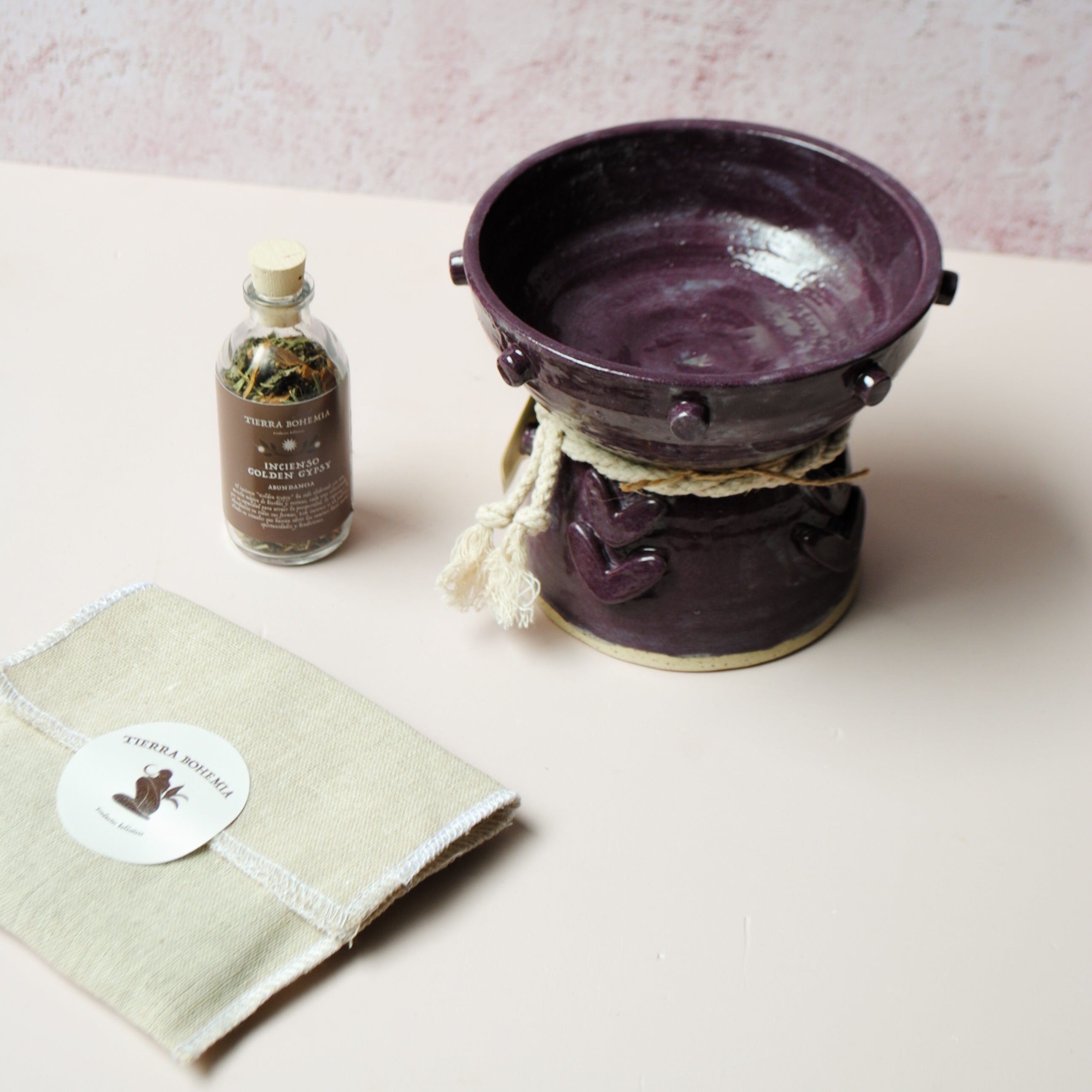 Este set fue creado en colaboración con Estudio Kiin, quienes moldearon a mano cada copalera en cerámica de alta temperatura, inspirándose en la tierra, el fuego y la conexión con lo ancestral.