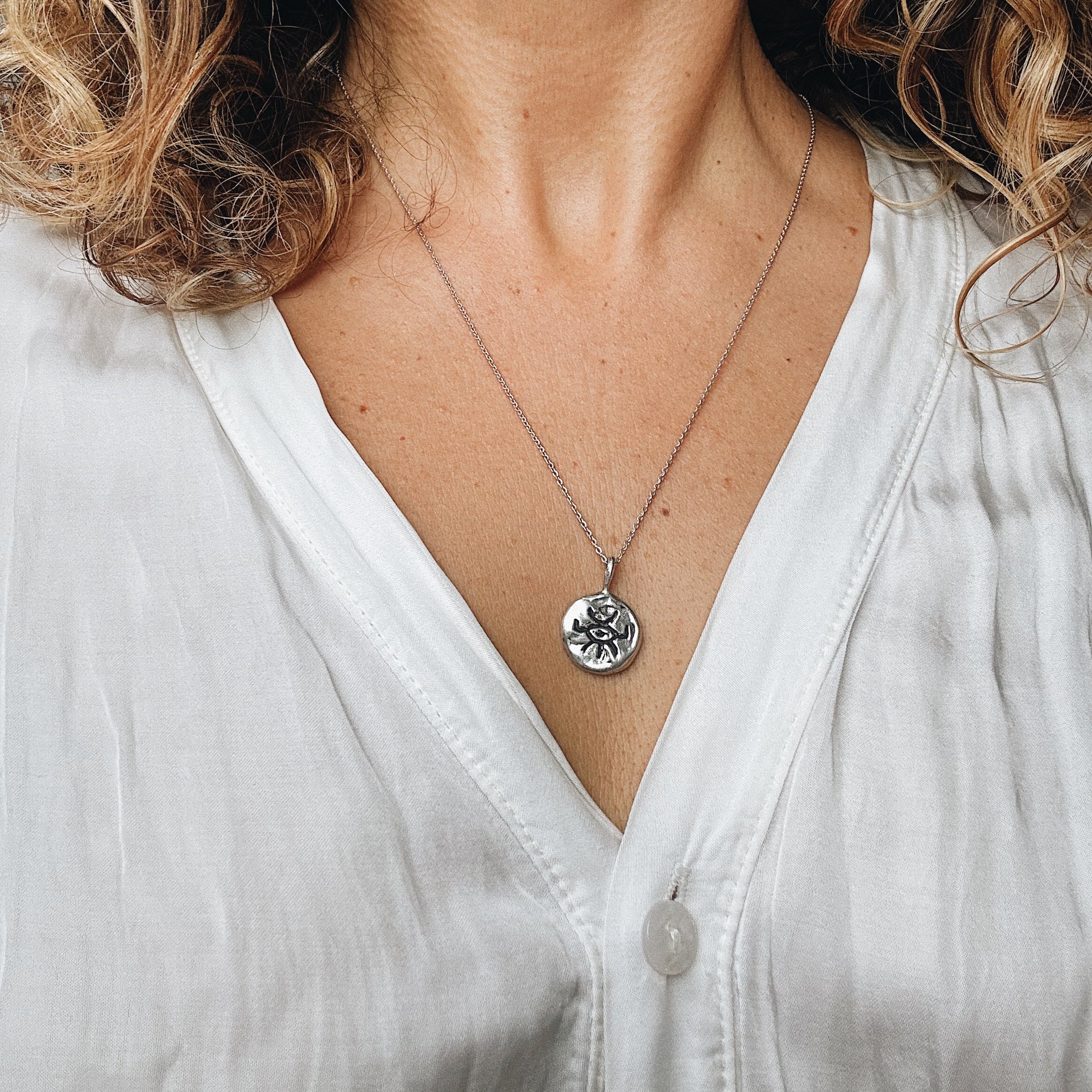In Motion es un medallón de plata que porta el símbolo Ollin, un antiguo y poderoso signo azteca que representa el movimiento, la transformación y la vida en constante proceso.Esta pieza refleja una forma de habitar el cambio desde la conexión con el flujo natural de la vida. Su energía se siente orgánica y sostenida: el movimiento como ritmo, no como empuje.
