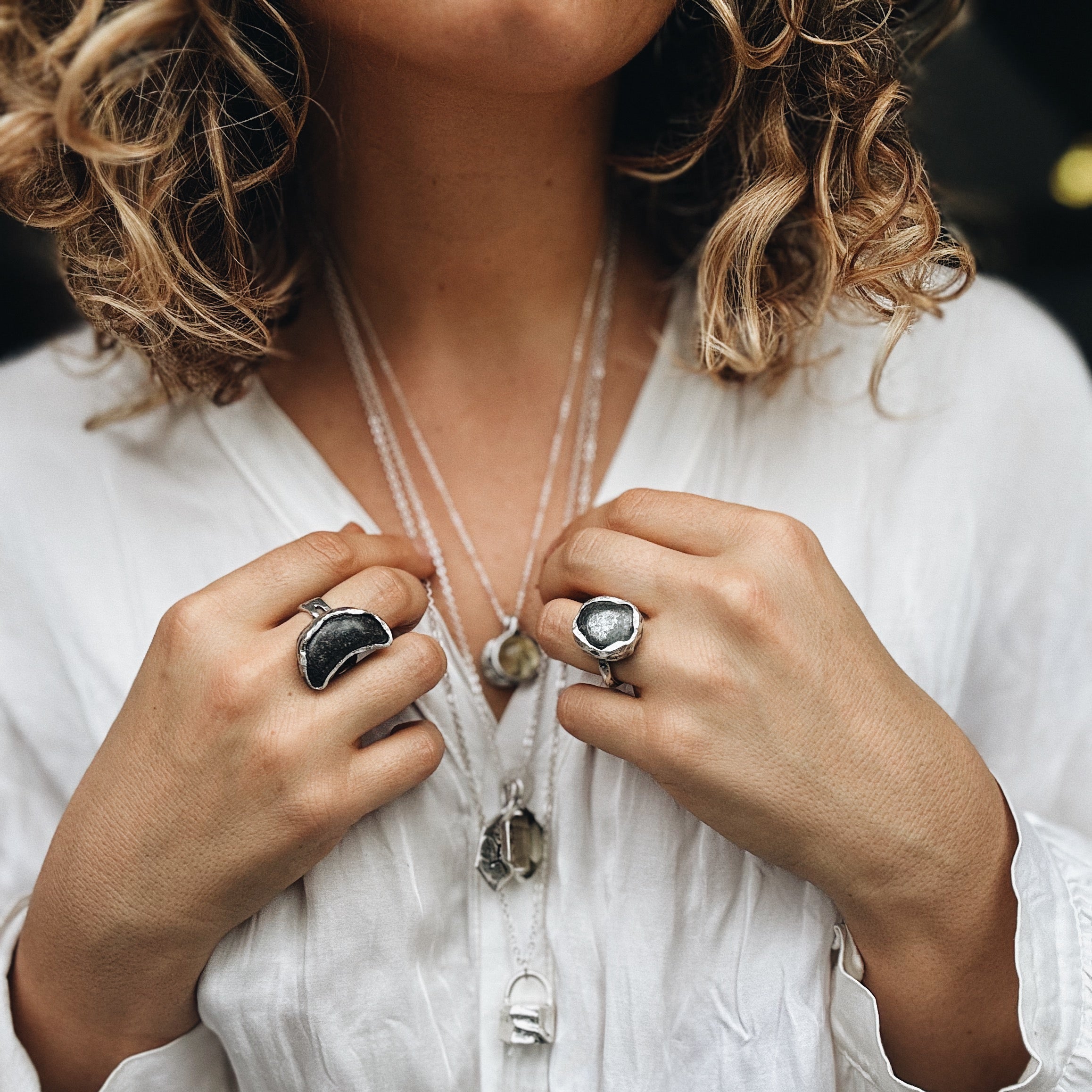 Todas las piezas son elaboradas con amor e intención, utilizando plata reciclada y piedras naturales cuidadosame